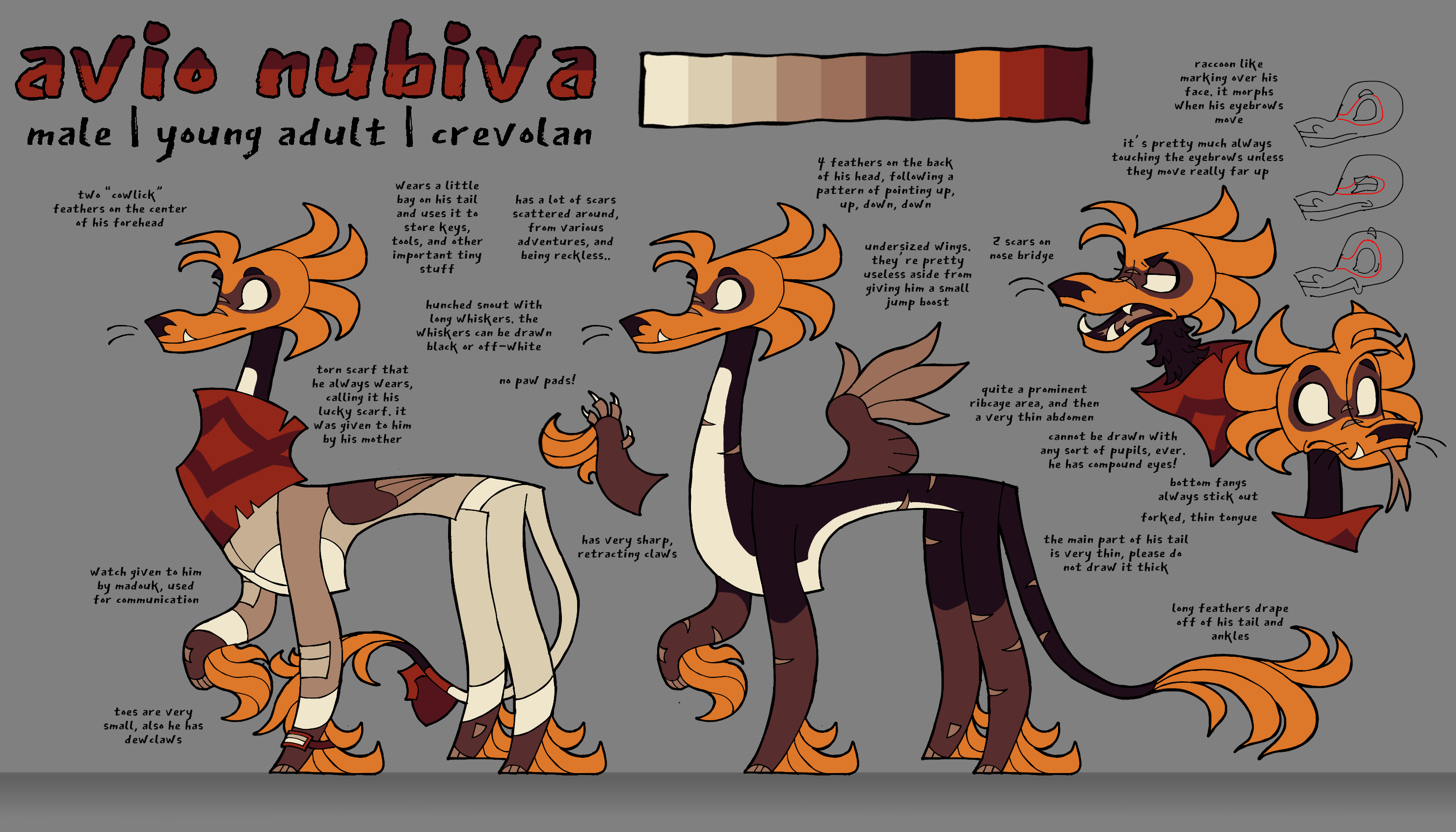 Physically, Avio is a quadrupedal, feathered creature, reminiscent of a canid. His body is covered in feathers of varying lengths, with the most notable being the bright orange feathers on his head, ankles, and tail tip. His eyes are pure white, as Crevolans have compound eyes - similar to those of arthropods - while also lacking pseudopupils, giving them a pretty unique look. As mentioned before, Avio’s wings are undersized, seemingly due to some kind of birth defect that halted their growth his beyond early childhood.